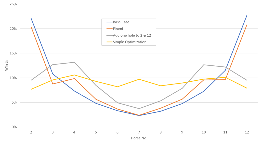 Jeg kommer derfor til å legge til et ekstra hull på 2 og 12, og vurderer å tette noen hull på senter-hestene for å gjøre det litt mer spennende. Grafene over er basert på 10.000 samples med stryking så ikke all verden til sample size. Jeg vurderer da å legge meg på den gule grafen men problemet er at den gule grafen inkluderer stryking som igjen vil si at om senter-hestene IKKE strykes så har de større sannsynlighet for å vinne så det blir weird uansett. For å forenkle – om en senter-hest IKKE strykes vil den ha høyere sannsynlighet for å vinne om jeg legger opp til antall hull som den gule grafen baserer seg på. Men om man ser over 10.000 løp så blir det ca. likt for alle hester da sannsynligheten for å strykes er høyere for senter-hestene. Dere kan lese mer om utregningen her.
