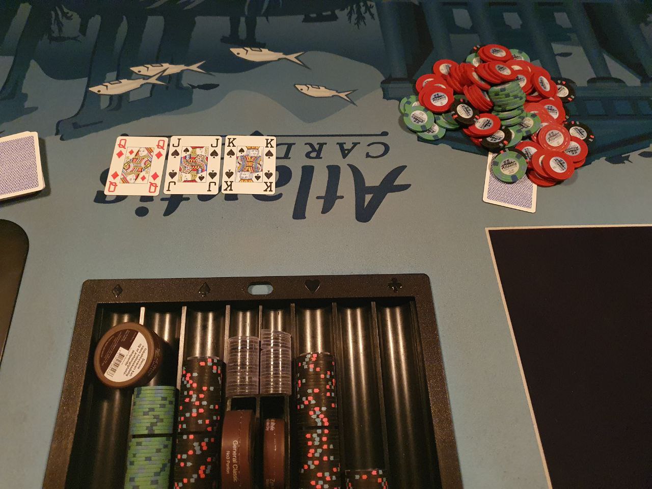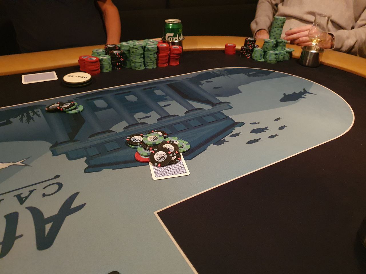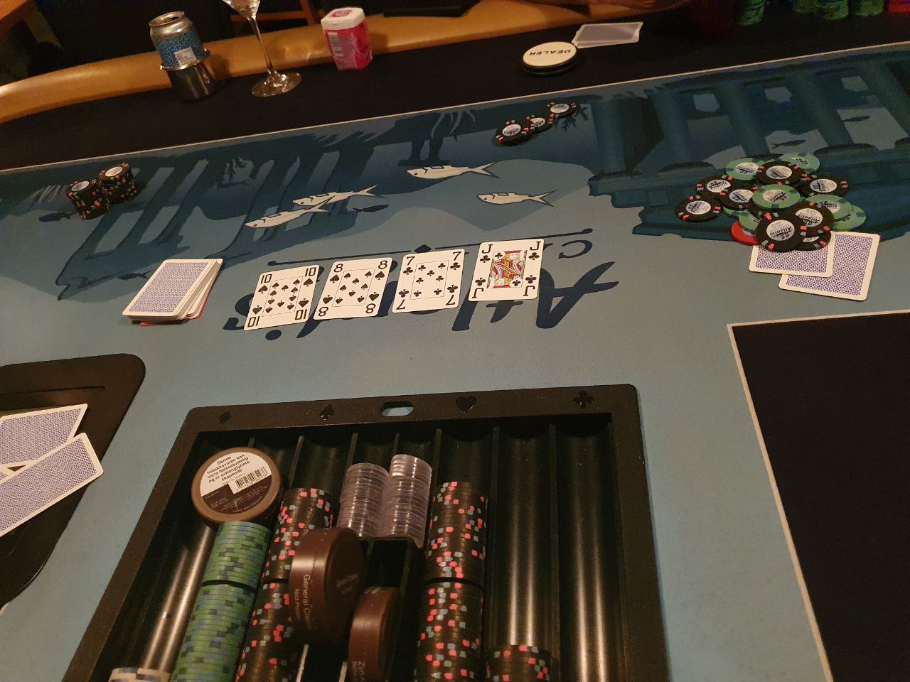 Igjen var vi 9 spillere og som vanlig busta jeg godt før penga, men fikk i hvert fall høsta inn litt poeng på bounty da jeg stoppa Marius fra å vinne turneringa for tredje gang på rad denne sesongen. Dessverre var det 3 spillere som tenkte at det var dritlurt å gå allin mot Steinar under rebuyperioden og siden han er den eneste som vet hvordan man forvalter en chipstack så stakk han av med seieren. Nytt denne gangen var at jeg hadde fått Norwegian Whalers bordet “tilbake”. Dette tilhører egentlig jobben og ble vel kjøpt på midten av første årtiet dette millennium og var den første store investeringa i laget. Siden det nå var 3-6 spillere fra det originale laget med (avhengig av når man regner), så ble det jo en fin symbolikk der. Det var også en liten testrunde for å se om 2-bords turnering er gjennomførbart. Det var ikke god plass men jeg kommer tilbake til dette.