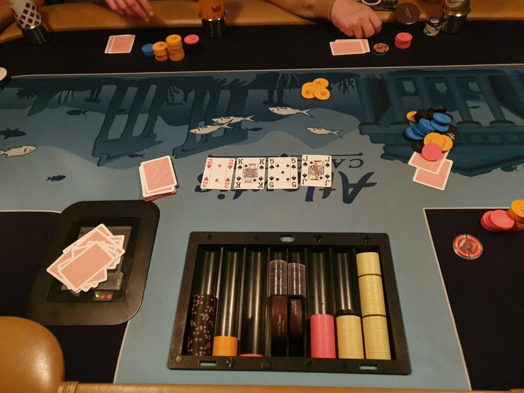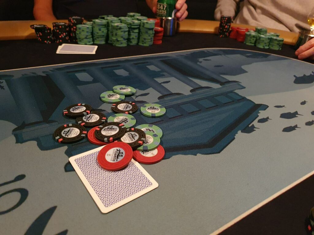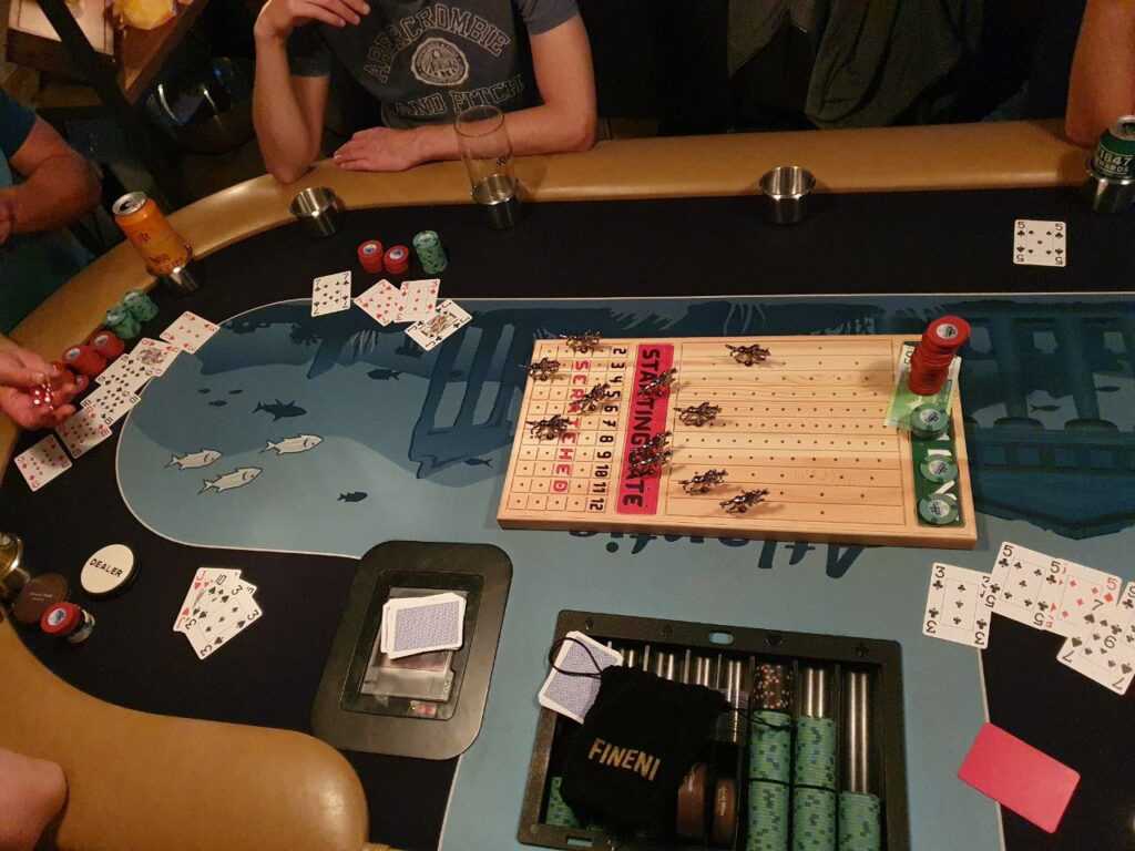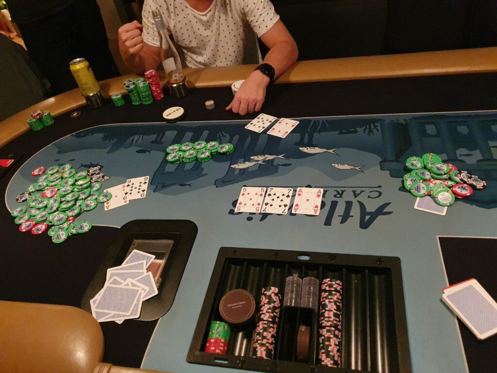 Igjen var vi 9 spillere og som vanlig busta jeg godt før penga, men fikk i hvert fall høsta inn litt poeng på bounty da jeg stoppa Marius fra å vinne turneringa for tredje gang på rad denne sesongen. Dessverre var det 3 spillere som tenkte at det var dritlurt å gå allin mot Steinar under rebuyperioden og siden han er den eneste som vet hvordan man forvalter en chipstack så stakk han av med seieren. Nytt denne gangen var at jeg hadde fått Norwegian Whalers bordet “tilbake”. Dette tilhører egentlig jobben og ble vel kjøpt på midten av første årtiet dette millennium og var den første store investeringa i laget. Siden det nå var 3-6 spillere fra det originale laget med (avhengig av når man regner), så ble det jo en fin symbolikk der. Det var også en liten testrunde for å se om 2-bords turnering er gjennomførbart. Det var ikke god plass men jeg kommer tilbake til dette.