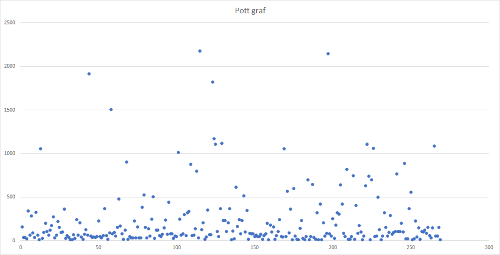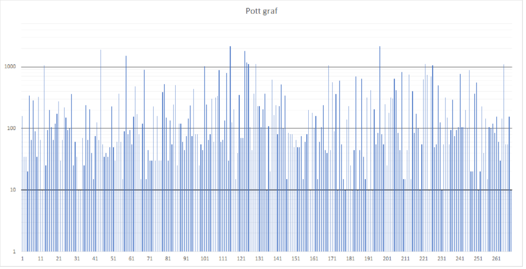 Hvis vi legger oss på 5% rake og med max 1BB per hånd så har vi antagelig raket inn beløpet i løpet av to kvelder samt at potter under Kr 100,- trolig ikke blir raket. Siden jeg uansett måtte regne på det, så lagde jeg noen grafer over pottene, der horisontal akse er antall hender, og vertikal er i kr. Lagde først en logaritmisk for enklere å se pottene under Kr. 100,- og der etter en lineær for å se de store.