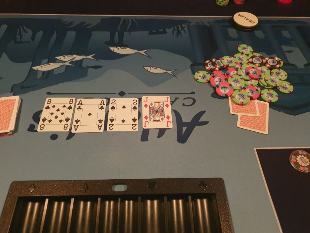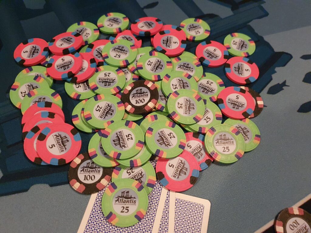 Så la oss starte med forrige live – Finding Nemo 8/9. Det var uten tvil en for rekordbøkene, mye takket være Thomas. 10 spillere, 37 rebuys og 10 add-ons… Jeg gikk tom for turneringschips, og jeg har en bank på over 500.000 turneringschips. Ironisk nok så hadde jeg bestilt flere turneringschips i november og de kom dagen etter dette, så nå har jeg rundt 850k så får jeg bare håpe at det ikke blir like vilt med to bord.