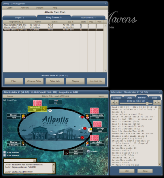 Buy in : Kr. 300,- for 5.000 chips. Fordeling: Kr. 100,- til ligapott, Kr. 200,- til turneringspott.