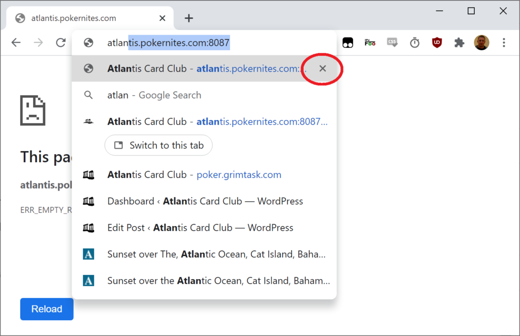 Dersom du bare skrev inn adressen og satset på auto-fullfør fra nettleseren så bør du slette det forslaget nå. Det gjør du ved å trykke på x-en til høyre for adressen den foreslår: