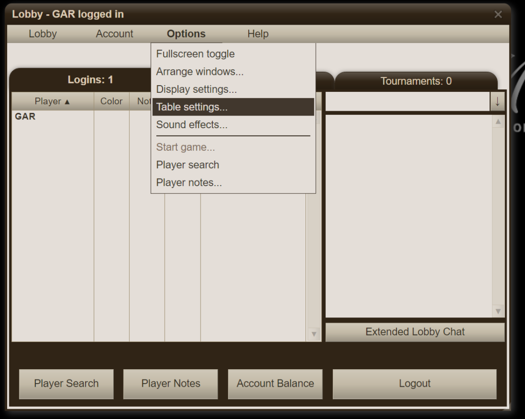 Innstillingene du har lagret tidligere som f.eks. brukernavn og passord, skru av Auto Muck, 4-farget kortstokk, pre-flop bet beløp o.l. er lagret i nettleseren din og ikke kontoen din på serveren. Siden vi nå bruker den krypterte adressen er disse innstillingene borte da nettleseren tolker dette som en annen side enn der du har spilt tidligere og du må sette dette på nytt. De fleste innstillingene finner du i Lobby-vinduet, Options og Table Settings…