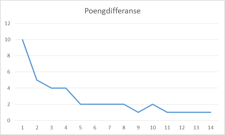 Når det gjelder poeng så fungerte det egentlig som planlagt. Her kjører vi jo ikke en linær modell men en mer topptung struktur. Den slo ikke så voldsomt ut på slutten selv om vi var en del flere, samtidig som det skal bety litt å vinne over 13 andre.